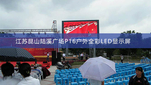 江蘇昆山陸溪廣場(chǎng)P16戶外全彩LED顯示屏由智彩科技定制、安裝。產(chǎn)品型號(hào):P16全彩屏,面積:50平方米。